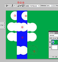 1의 아이콘을 클릭하면 메뉴가 나오는데 2는 선택의 표시인 점선이 나오고 3은 퀵마스크모드의 오버레이색상이 나옵니다. 이 색을 변경하려면 퀵마스크모드아이콘을 더블클릭하면 됩니다. 4에서 On Black은 배경을 검정색으로 On White는 흰색으로 볼 수 있게 하고 Black & White는 레이어마스크형태의 검정색과 흰색으로 볼 수 있게 합니다. 흰색은 선택된 부분으로 나오고 검정색은 선택되지 않은 부분입니다. On layers는 현재 이미지의 레이어 아래에 다른 레이어가 없는 경우 투명하게 체크무늬로 나옵니다.