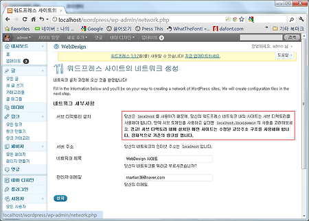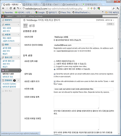 이전 글에서 이어집니다. 2. 네트워크 관리 다중사이트를 사용하면 블로그라는 의미에서 웹사이트의 개념으로 범위가 확장됩니다. 이는 하나의 블로그가 아닌 여러 개의 블로그가 모인 커뮤니티가 되므로 웹사이트인 것이죠. 그래서 명칭도 다중 블로그가 아닌 다중사이트가 되는 것입니다. 로그인해서 들어오면 별로 바뀐 것이 없어 보입니다. 사이드 메뉴에 내 사이트가 추가된 것이 보이고 우측 상단에서 “안녕하세요. Admin님”을 클릭하면 “네트워크 관리자”항목이 추가되어 있습니다. 그리고 이전에 도구메뉴에 있던 “네트워크 설정”은 없어졌습니다. 우선 돌아보기 쉽도록 관리자바를 다시 만듭니다. 사이드 메뉴의 “사용자” 메뉴로 들어가서 관리자 바에 체크하고 저장하면 관리자 바가 나타납니다. 내 사이트나 네트워크 관리자를..