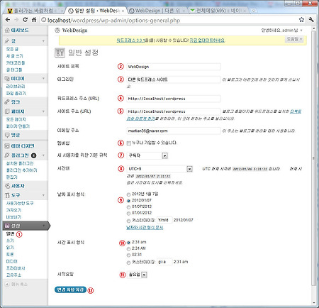스마트폰을 사면 사용법을 알아야 사용하기 편리하듯이 워드프레스를 시작하기전에 각종 설정에 대해 자세히 알아두고 설정을 해두는 것이 사용자에게 아주 편리합니다. 환경설정에는 일반설정, 쓰기, 읽기, 토론, 미디어, 프라이버시, 고유주소 설정이 있습니다. 반드시 필요한 사항에 대해서만 설명드립니다. 1. 일반설정 관리자화면에서 하단의 설정메뉴에서 일반을 클릭하면 우측에 화면이 나옵니다. 사이트제목은 처음 워드프레스를 설치할때 입력했더라도 수정할 수 있습니다. 태그라인도 사이트의 특징적인 원하는 문구로 변경하세요. 로컬호스트에서 워드프레스 주소는 변경은 할 수 없습니다. 마찬가지로 웹호스팅에 가입하고 설치한 경우 호스팅회사의 가이드대로 설치하면 내 블로그 접속시 wordpress라는 워드프레스가 설치된 디렉토..