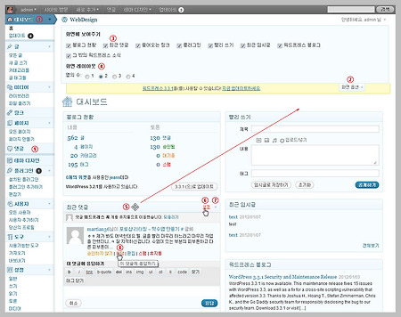 워드프레스의 댓글관리는 관리자화면의 대시보드에서도 할 수 있지만 모든 댓글이 모여있는 댓글페이지에서 관리하는 것이 편리합니다. 댓글의 편리한 관리를 위한 키보드단축키를 사용방법과 스팸댓글 방지를 위한 Akismet 플러그인의 설치방법을 알아봅니다. 1. 댓글관리 워드프레스의 대시보드에 오면 처음보이는 관리자화면은 티스토리의 관리센터와 같습니다. 티스토리 블로그의 글을 데이터 백업하여 이동해 왔더니 글과 댓글이 많아졌습니다. 노란색 바에 있는 화면옵션을 클릭하면 각각의 관리패널을 보이게 하거나 안보이게 설정할 수 있고 화면 레이아웃의 열의 수를 선택하여 스크린에 맞는 배열을 할 수 있습니다. 각 패널의 타이틀 바에 마우스 오버하면 커서가 바뀌고 클릭드래그하여 원하는 곳으로 이동배치할 수 있으며 타이틀바 우..