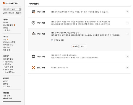 내 컴퓨터의 WAMP서버에 설치된 워드프레스에 티스토리 블로그 글을 모두 다운 받아 설치작업을 해봅니다. 다른 블로그와는 다르게 티스토리는 설치형 블로그와 같아서 모든 데이터를 백업하여 태터툴스나 워드프레스로 이전할 수 있습니다. 작년 10월에 백업해둔 자료가 1.4기가정도 되는데 워드프레스에 업로드하는데 한시간 정도 걸렸으며 전부 이동시킨 후 업로드 폴더에 보니 파일이 만개가 넘었습니다. 여기에는 글에 사용된 사진과 각종 압축파일자료가 포함되어있었습니다. 그러니까 6월 말 경부터 10월까지 올린 파일이 만개가 되는군요. 1. 티스토리 블로그 데이터 백업 티스토리 관리자 센터에서 좌측메뉴의 데이터 관리를 선택하면 우측과 같은 화면이 나옵니다. 데이터 백업의 우측에 있는 작은 세모를 클릭하면 화면이 늘어나..