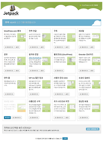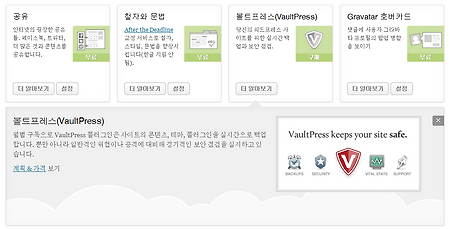 워드프레스 젯팩(Jetpack) 플러그인의 철자와 문법은 After the Deadline 이라는 교정 서비스로 인공지능을 이용하여 에러를 찾아내고 올바른 제안을 해서 글 작성을 향상시킵니다. 글 편집시 철자를 자동으로 교정해주는 기능이지만 영어권 언어만 지원되므로 생략합니다. 한글 안됨으로 번역을 추가해놨습니다. 볼트프레스는 월별 구독으로 사이트의 콘텐츠, 테마, 플러그인을 실시간으로 백업합니다. 뿐만 아니라 일반적인 위협이나 공격에 대비해 정기적인 보안 점검을 해주며 유료 서비스입니다. 더 알아보기 버튼을 클릭하면 설명이 나타나며 계획 및 가격 링크를 클릭하면 아래의 화면으로 이동합니다. 그라바타 호버카드 사용하기 그라바타 호버카드는 일종의 인터넷 명함입니다. 젯팩 페이지에서 그라바타 호버카드의 설정..