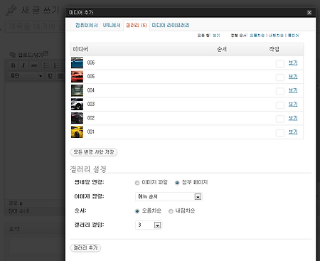 워드프레스의 새 글 쓰기에서 여러장의 이미지를 업로드하면 간단하게 이미지 갤러리를 만들 수 있습니다. 워드프레스 젯팩(Jetpack)의 캐러젤은 이렇게 만든 이미지 갤러리를 간단한 설정만으로 전체화면에서 이미지를 크게 볼 수 있고 내비게이션 버튼을 클릭하면 캐러젤(Carousel: 회전목마) 형태로 여러 이미지를 둘러 볼 수 있는 환경을 제공합니다. 우선 이미지 갤러리 만드는 방법을 알아봅니다. 워드프레스 새 글 쓰기 화면에서 미디어 업로드 버튼을 클릭하면 미디어 추가 화면이 나타납니다. 파일선택 버튼을 클릭해서 내 컴퓨터의 이미지를 Shift키나 Ctrl 키를 사용해서 여러장 선택하고 열기 버튼을 클릭하면 업로드 됩니다. 창의 하단에서 "모든 변경 사항 저장" 버튼을 클릭하면 상단에 갤러리 탭이 만들어..