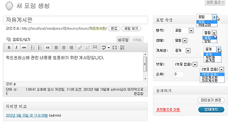 포럼 만들기 비비프레스의 포럼은 사용하기에 따라서 여러가지 용도를 정할 수 있습니다. 원래의 취지대로 토론을 위해 포럼을 만들 수 있지만 웹사이트의 게시판으로 사용할 수 있습니다. 블로그가 아닌 웹사이트라면 방문자가 문의사항에 대한 글을 쓸 수 있는 곳이 필요합니다. QNA용도로 쓸수도 있고 자유게시판으로 사용할 수도 있습니다. 여기서는 자유게시판을 만들어 보겠습니다. 비비프레스의 포럼은 실제 글을 쓰기 위한 공간을 의미하며 블로그의 페이지와 같은 역할을 합니다. 주메뉴에서 포럼새 포럼을 선택하면 포럼을 만들 수 있는 화면이 나타납니다. 일반 글 쓰기 화면과 같은 형태지만 옵션이 많이 다릅니다. 형식에서 포럼과 카테고리를 선택할 수 있는데 카테고리는 포럼을 카테고리 형태로 분류하기 위한 것이고 실제 포..
