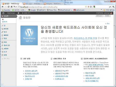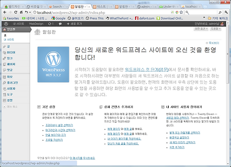 최근에 워드프레스 최신 버전인 3.3.2가 한글 언어파일이 추가되어 한글 버전도 최신 버전으로 사용할 수 있게 됐습니다. 며칠간 최신 버전의 워드프레스 영문판에 한글 언어파일을 업데이트하는 번역작업을 했는데 공교롭게도 완료하자 마자 한글판이 이전의 3.2.1 버전에서 최신버전으로 업데이트가 가능하다는 메시지가 뜨더군요. 헛일 했다는 생각에 새 버전을 내려받아 설치하고 보니 일부 용어들이 영어로 그대로 남아 있고 도움말 부분이 대부분 영어로 그대로 남아 있었습니다. 예전의 3.2.1버전의 한글 부분을 그대로 이전하고 추가된 용어나 도움말에 대해서는 전혀 번역이 안 된 것 같습니다. 위 이미지는 초기화면인 대시보드(새 버전에서는 알림판으로 교체됨)의 화면입니다. 공식판을 다운 받아 설치하면 위 내용이 전체가..