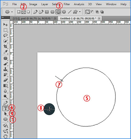 둥근 패스에 글자쓰기는 간단하면서도 까다롭습니다. 여러번 연습을 해야 합니다. 패스는 벡터툴이므로 펜툴과 타이프툴과 같이 있습니다. 벡터란 도형을 수학적 방정식에 의해 그리는 방법입니다. 컴퓨터가 알아서 해주는데 크기를 늘리거나 줄여도 깨끗한 모양이 나오는 것은 수학적 좌표를 재계산 해서 그려주기때문입니다. 이 도구 그룹에 있는 것은 벡터툴인 패스로 그림을 그리게 됩니다. 타이프툴도 외곽선이 패스로 구성되어있고 이 외곽선 안에 색을 칠하는 것일뿐입니다. 이러한 벡터도형을 이동하거나 편집하려면 일반적으로 쓰이는 이동툴은 안되고 아래사진에서 4번의 패스선택도구나 직접선택도구으로 해야 가능합니다. 1의 셰이프툴을 선택하고 패스를 그리기위해 2번의 아이콘을 클릭합니다. 2번의 좌측에 있는 셰이프아이콘을 클릭하면..