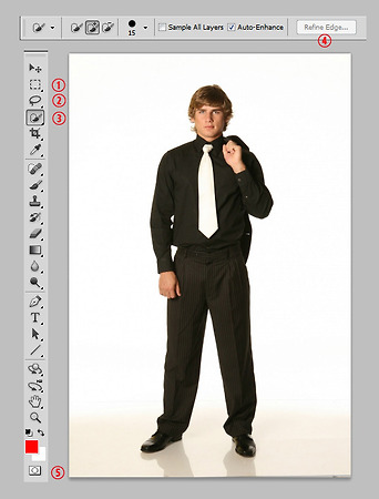 연습용사진 다운로드 1. 선택툴그룹 포토샵의 도구모음에서 상단에 있는 이동툴부터 스포이드툴까지가 선택툴 그룹입니다. 이는 이미지를 선택하여 이동하거나 잘라내거나 색을 선택하는 기능을 하는 도구들입니다. 이미지의 일부분을 잘라내기 위해서는 1의 도형선택툴, 2의 라쏘툴, 3의 빠른선택툴을 사용하면 빠르게 선택하여 잘라낼 수 있습니다. 머리카락같은 복잡한 이미지는 이런 도구로 간단히 선택이 안되므로 다른 도구인 5의 퀵마스크모드와 같이 사용하면 효율적인 선택을 할 수 있습니다. 이런 선택도구는 항상 4의 리파인엣지(Refine Edge)도구가 따라다닙니다. 2. 빠른선택툴(Quick Selection Tool)의 사용법 1의 빠른선택툴을 선택한 후 2의 아이콘을 클릭합니다. 3을 사용하면 한번밖에 선택이 안..
