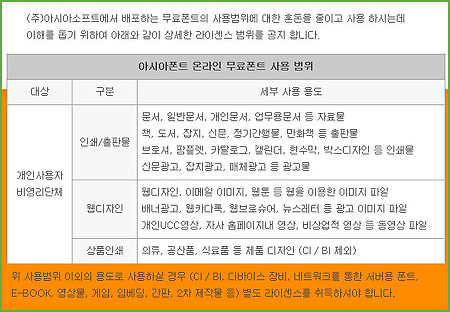 아시아폰트에서 제공하는 무료폰트는 아주 많습니다. 물론 개인용과 비영리단체에만 해당되고 상업용은 구매를 해야 이용이 가능합니다. http://www.asiafont.com/ 위 링크를 접속하고 무료폰트자료실로 이동합니다. 자료실의 처음항목에 나오는 아시아폰트 설치방법과 설치안내를 참고하여 다운 받으면 됩니다. 사용범위를 잘 읽어보셔야 합니다.
