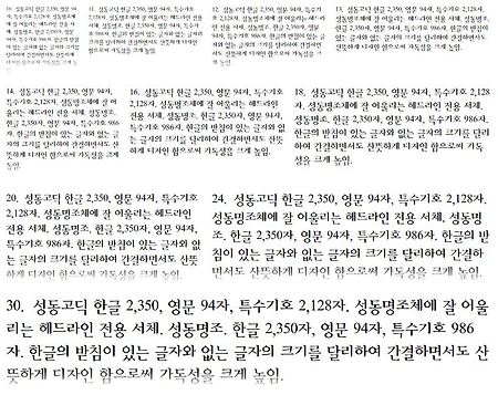 성동서체는 서울시 성동구에서 제작한 폰트로 다음과 같이 무료로 사용할 수 있는 폰트입니다. 성동고딕체, 성동명조체의 지적재산권은 성동구청에 있습니다.성동고딕체, 성동명조체 사용자들은 다른 이에게 자유롭게 배포할 수 있으나, 어떠한 경우에도 대가를 요구하거나 수정해서 판매할 수 없으며, 배포된 그대로 사용해야 합니다. 웹폰트로의 변환이 위의 "배포된 그대로 사용해야 합니다"에서 제외되는지 여부가 분명치 않아 그동안 웹폰드로 변환해 배포하기를 꺼려했는데 제외된다면 알려주세요. 배포를 중지하도록 하겠습니다. 성동서체는 고딕체와 명조체 두 가지이며 고딕체는 Bold, Extra Bold, 명조체는 Bold, Regular가 있습니다. 명조체와 고딕체에 관해서는 이곳의 글을 참고하세요. 일반폰트 다운로드는 아래의..