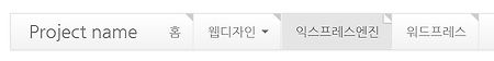 이전 글에서 익스프레스 엔진의 메뉴를 2단 서브 메뉴로 만들고 부트스트랩 라이브러리 파일들을 추가했습니다. 이번 글에서는 내비게이션 메뉴바를 만들어보겠습니다. 이전 글에서 알아봤듯이 익스프레스 엔진의 메뉴 구조는 여러가지 변수와 조건문에 의해 만들어지고 있어서 부트스트랩의 메뉴 선택자를 적절하게 나타나도록 조건문을 이용하면 됩니다. 메뉴바 만들기 이전 글에서 부트스트랩의 기본 메뉴 구조에 대해 알아봤는데 반응형 메뉴바는 몇가지 태그와 선택자가 추가됩니다. Project name 반응형 메뉴바는 화면 폭이 축소됐을 때 좌우로 정렬돼 있는 메뉴들이 상하로 배열되면서 감춰지고 버튼이 나타나며 버튼을 클릭하면 감춰진 메뉴들이 나타나는 구조입니다. 이러한 버튼 역할을 하는 것이 class="btn btn-navb..