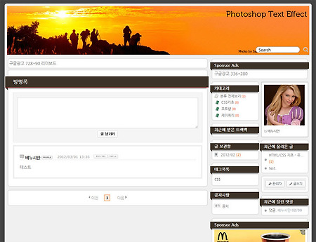 방명록, 태그, 공지사항, 사이드바 제목 부분에 리본을 추가한 버전입니다. 글자의 색상과 배경색상을 변경하려면 #sidebar h3를 검색하여 색상코드를 바꿔주면 됩니다. 1은 글자색상이고 2는 배경색상입니다. 위와 같이 변경했을때 아래처럼 나오게 됩니다. 글자의 색상이 짙으면 배경 색상은 옅은 색으로 해야하고 서로 대비되는 정도가 높아야합니다. 사이드바가 양쪽에 배치된 버전입니다. 글자와 배경색상을 변경하려면 #sidebar-one #category로 검색하여 1에서 글자색상, 2에서 배경색상을 변경하면 됩니다.
